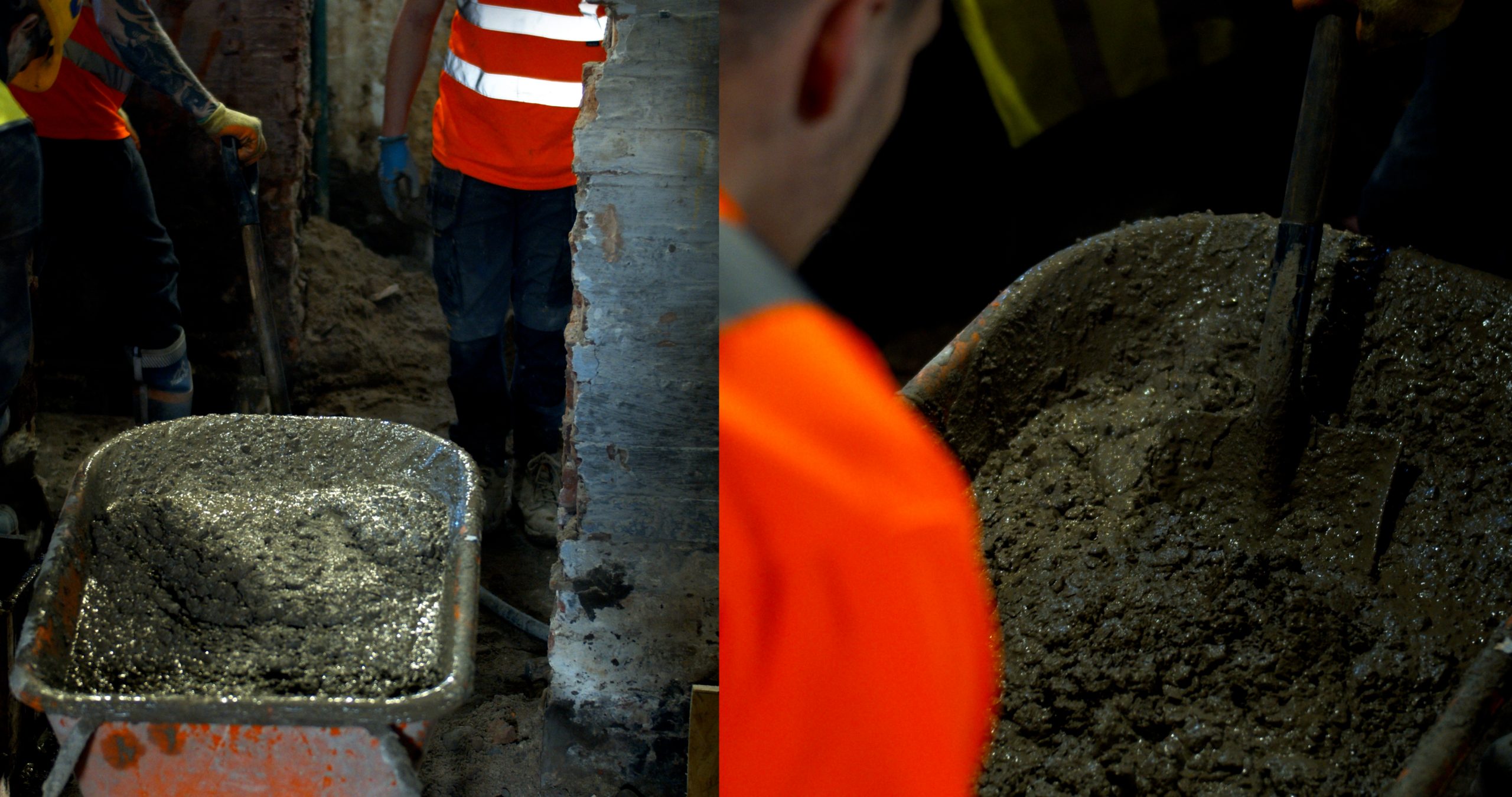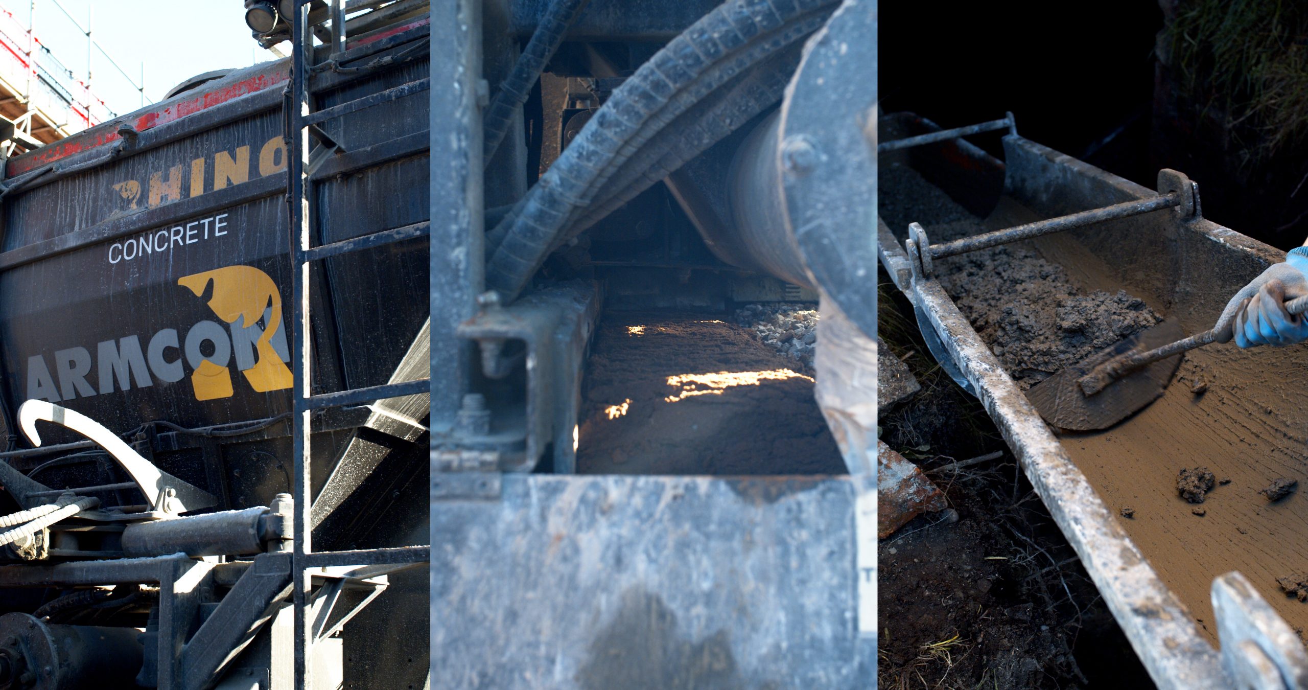 Over the course of seven days, we installed 50.25 cubic-metres of C35 concrete for the underpin. The chute was extended at maximum length to the basement level, where the concrete was collected in a wheelbarrow and then installed by either tipping or shovelling.